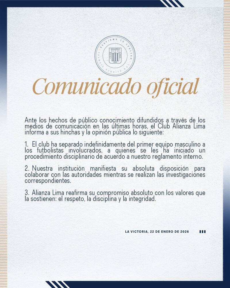 Al conocerse los hechos, Alianza Lima tomó medidas inmediatas y separó indefinidamente del plantel a los tres acusados.
