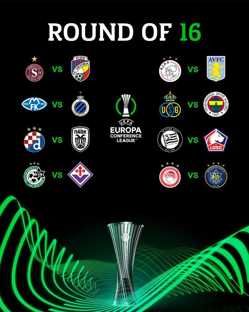 Respecto a la Conference League, entre los duelos más destacados para octavos de final quedó el choque entre el Ajax de Holanda contra el Aston Villa de Inglaterra, mientras que la Fiorentina de Italia enfrentará al Maccabi Haifa.