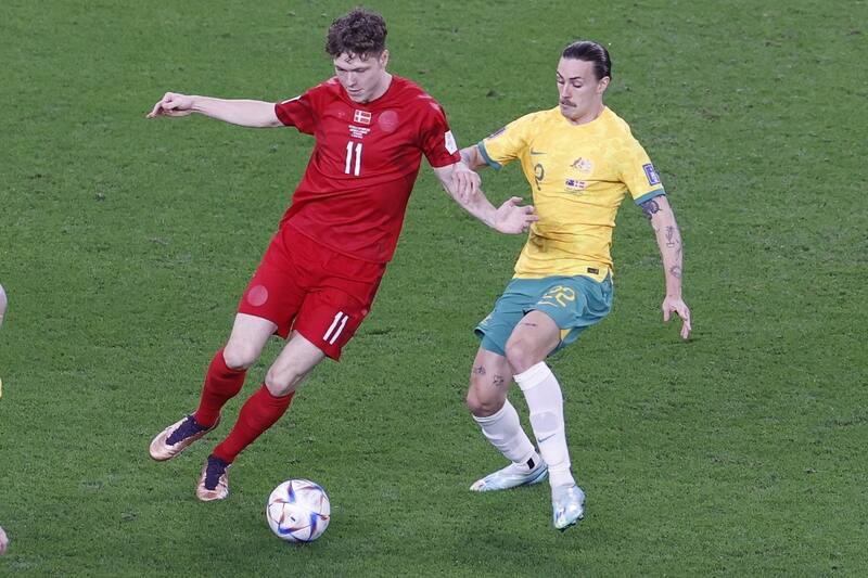 Salvo por un desborde y posterior remate de Joakim Maehle (18'), el duelo no tuvo muchas más emociones en el primer tiempo, gracias al buen trabajo defensivo de los "socceroos" y la poca claridad de los europeos en los metros finales.