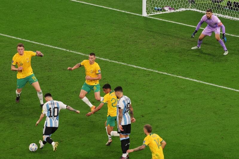 Argentina enfrenta un difícil partido ante Australia por los octavos de final del Mundial Qatar 2022. La "Scaloneta" no encontraba los espacios, pero logró conectar una buena jugada colectiva, que Lionel Messi culminó con un preciso zurdazo en área grande que dejó sin chance al arquero, Mathew Ryan