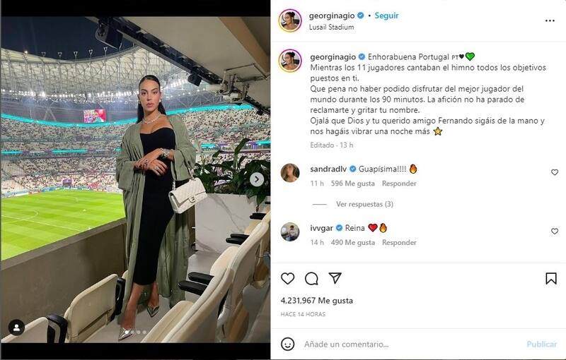 Si bien Cristiano se mostró calmo con la decisión, fue su novia, Georgina Rodríguez, quien usó sus redes sociales para apoyar a su pareja en este difícil momento. "Mientras los jugadores cantaban el himno todos los objetivos puestos en tí. Que pena no haber podido disfrutar del mejor jugador del mundo durante los 90 minutos. La afición no ha parado de reclamarte y gritar tu nombre", le escribió la modelo argentina de 28 años.