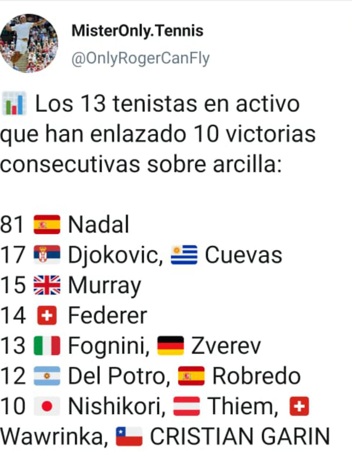 El chileno se codea junto a Kei Nishikori (31°), Dominic Thiem (4°) y Stan Wawrinka (16°) con diez triunfos al hilo, mientras que el ranking es comandado por el español Rafael Nadal (2°), quien ha sido ganador sobre arena batida 82 veces.