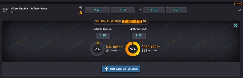 Otras cuotas señalan que, si Glover Teixeira logra ganar por KO o TKO, pagará 7.00 en una apuesta especial. También, si lo hace por sumisión, lo hará con 5.00. Si Smith se queda con el triunfo a través de un nocaut técnico o normal, pagará 1.95 a quienes participen en estas ofertas especiales que tiene Coolbet para hacer más emocionante esta pelea.
