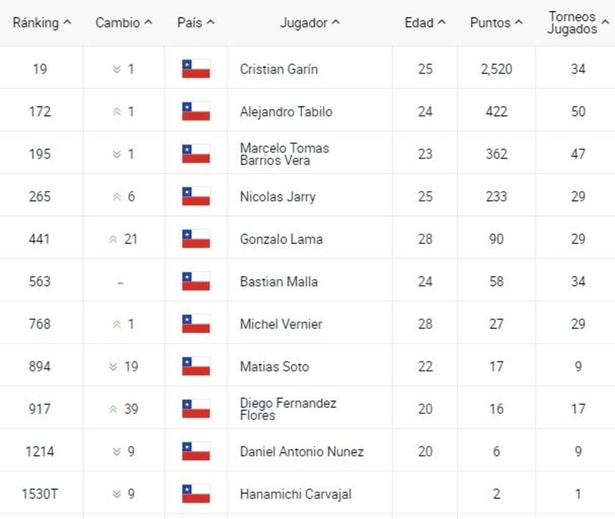 Otro que tuvo un ascenso, fue Alejandro Tabilo (+1) que pasó el casillero 171°. El nacido en Canadá aún espera lograr meterse en los Juegos Olímpicos, lo lograría si es que hay una deserción más.