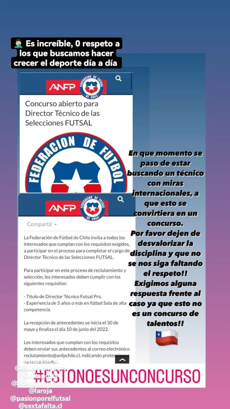 El asunto causó indignación en los seleccionados nacionales, quienes hicieron sentir su molestia en redes sociales, con un mensaje compartido por varios integrantes de La Roja Futsal. "En qué momento se pasó de estar buscando un técnico con miras internacionales, a que esto se convirtiera en un concurso. Por favor dejen de desvalorizar la disciplina y que no se nos siga faltando el respeto", dice la publicación compartida, entre otros por los seleccionados nacionales Bernardo Araya, Frank Carrasco, Bilan de la Paz y Renato Martínez-Conde.