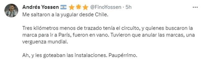 Yossen, sin embargo, no se achicó e incluso respondió. “Me saltaron a la yugular desde Chile. Tres kilómetros menos de trazado tenía el circuito, y quienes buscaron la marca para ir a París, fueron en vano. Tuvieron que anular las marcas, una verguenza mundial. Ah, y les goteaban las instalaciones. Paupérrimo”, fue su primera reacción.