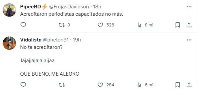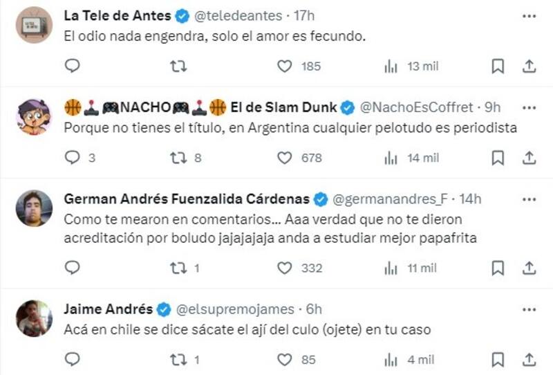 Era que no, de inmediato fueron docenas de chilenos quienes se lanzaron a la red social para contraatacar a Yossen. “Había un mínimo de Coeficiente Intelectual para obtener la acreditación” y “Eres periodista y no sabias que el trazado fue responsabilidad del comite olimpico? Ahi es cuando se nota que la educacion en argentina es gratuita pero no de calidad”, fueron algunas de las observaciones.