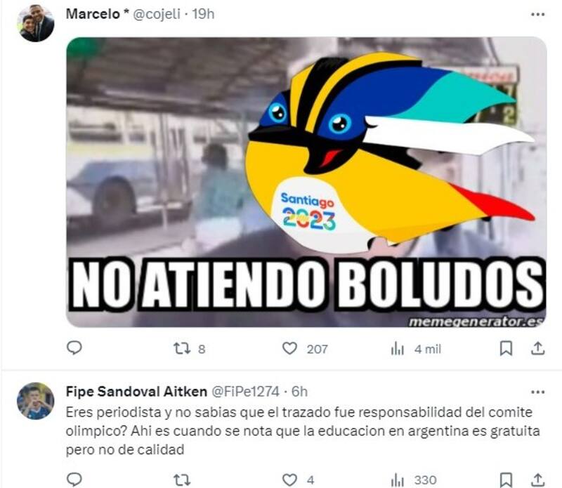 Incluso Gonzalo Fouillioux le respondió: “Yo no sé si lo haces para provocar, pero deberías saber que eso fue responsabilidad del comisionado de la Asociación Panamericana de Atletismo (APA). Cómo se nota que no viniste, organización de lujo, dicho por prácticamente todos los que vinieron. Del COI para abajo”.