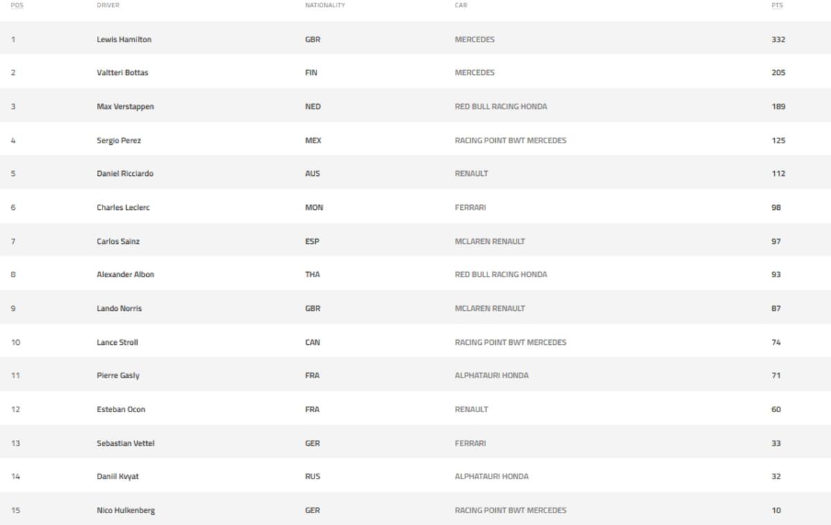 A falta de una carrera para el final de la temporada, el Gran Premio de Abu Dhabi, Bottas suma 205 puntos, mientras que Verstappen también tiene asegurada la tercera posición con 189 unidades. Mucho más arriba quedó el vigente campeón y heptacampeón del mundo, Lewis Hamilton (Mercedes), quien tiene 332 puntos y no compitió en el GP de Sakhir por dar positivo a coronavirus.