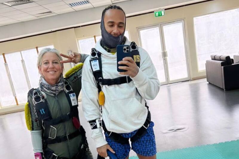 Esta vez Hamilton no se movió de Medio Oriente y fue a Dubai, Emiratos Árabes Unidos, para practicar paracaidismo en compañía de su fiel fisioterapeuta, Angela Cullen.