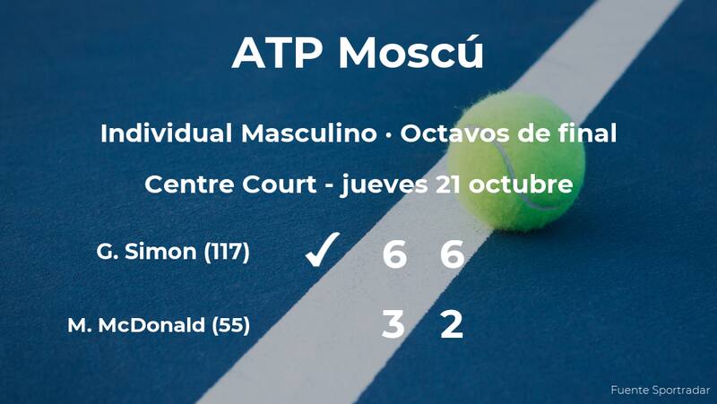 Guilles Simon, francés, número 117 de la ATP, dio la campanada al vencer en una hora y veinticuatro minutos por 6-3 y 6-2 a Mackenzie McDonald, tenista estadounidense, número 55 de la ATP, en los octavos de final del torneo ATP 250 de Moscú. Tras este resultado, el ganador estará en los cuartos de final del torneo ATP 250 de Moscú.