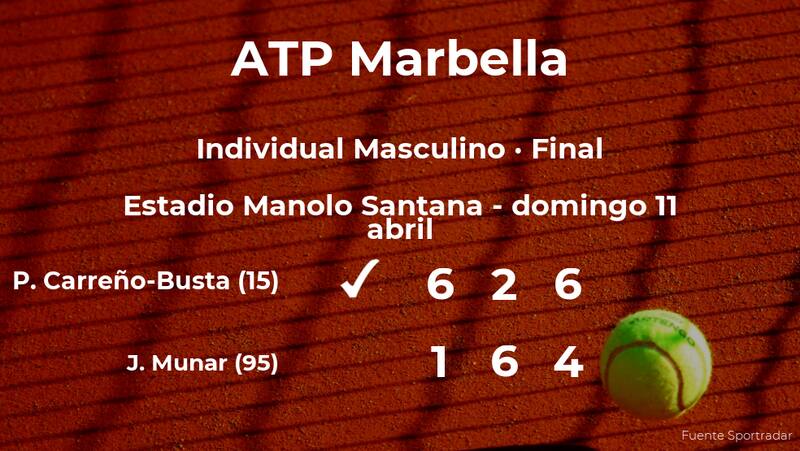 Pablo Carreño-Busta, español, número 15 de la ATP y cabeza de serie número 1, ganó en la final del torneo ATP 250 de Marbella por 6-1, 2-6 y 6-4 en dos horas y veinticinco minutos al español Jaume Munar, número 95 de la ATP. Con este resultado, el jugador se convierte en el nuevo campeón del torneo ATP 250 de Marbella.