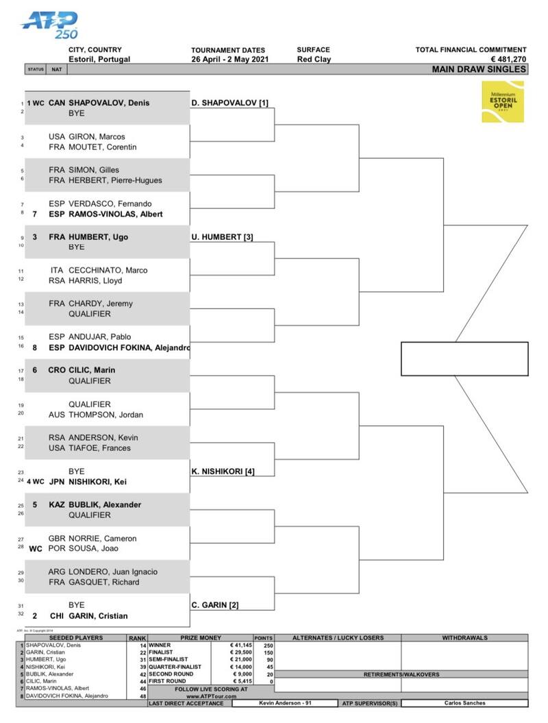 Este es el cuadro del ATP 250 de Estoril: