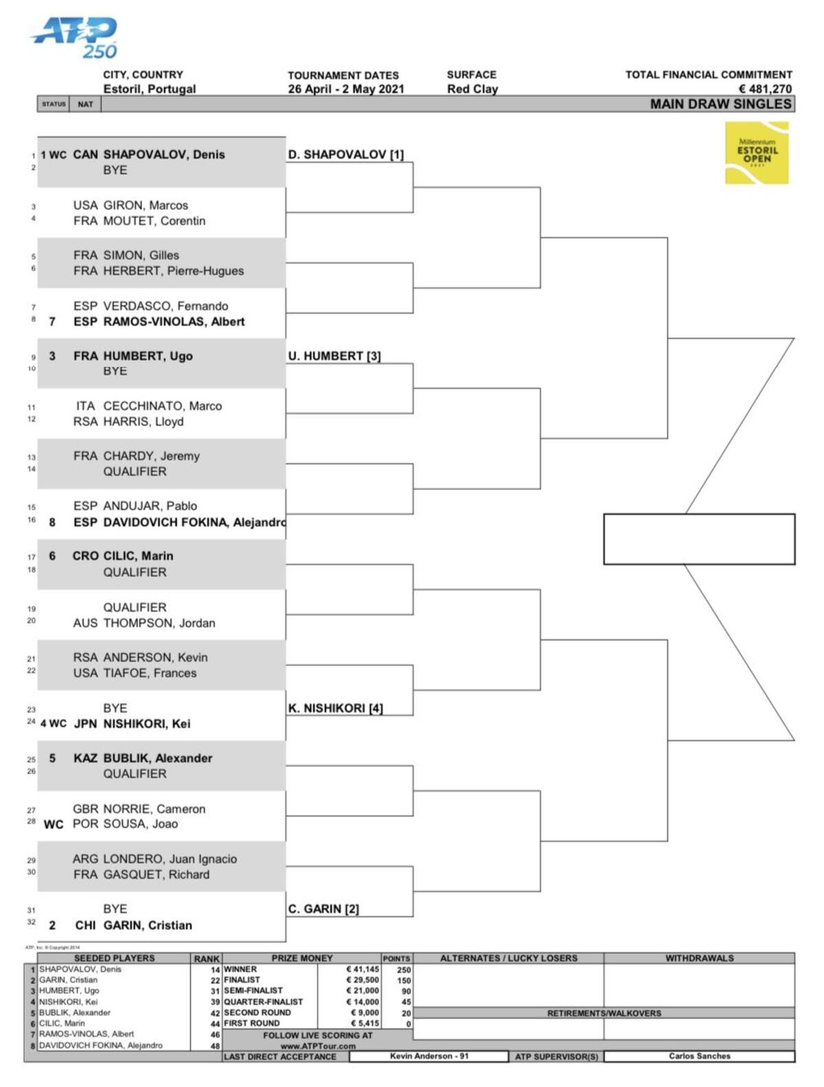 Este es el cuadro del ATP 250 de Estoril: