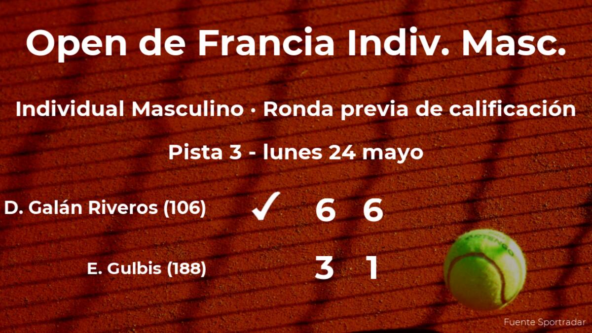 El colombiano Daniel Elahi Galán Riveros, número 106 de la ATP, venció en cincuenta y ocho minutos por 6-3 y 6-1 al jugador letón Ernests Gulbis, número 188 de la ATP, en la ronda previa de calificación de Roland-Garros. Con este resultado, el ganador estará en la siguiente fase de Roland-Garros.