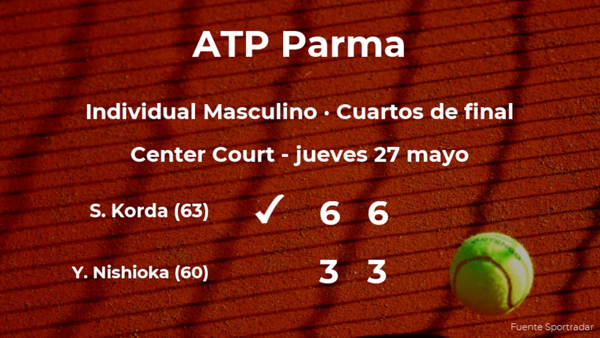 Sebastian Korda, estadounidense, número 63 de la ATP, cumplió las previsiones al vencer en los cuartos de final del torneo ATP 250 de Parma en una hora y veintiun minutos por 6-3 y 6-3 a Yoshihito Nishioka, tenista japonés, número 60 de la ATP y cabeza de serie número 8. Con este resultado, Korda logra clasificarse para las semifinales del torneo ATP 250 de Parma.