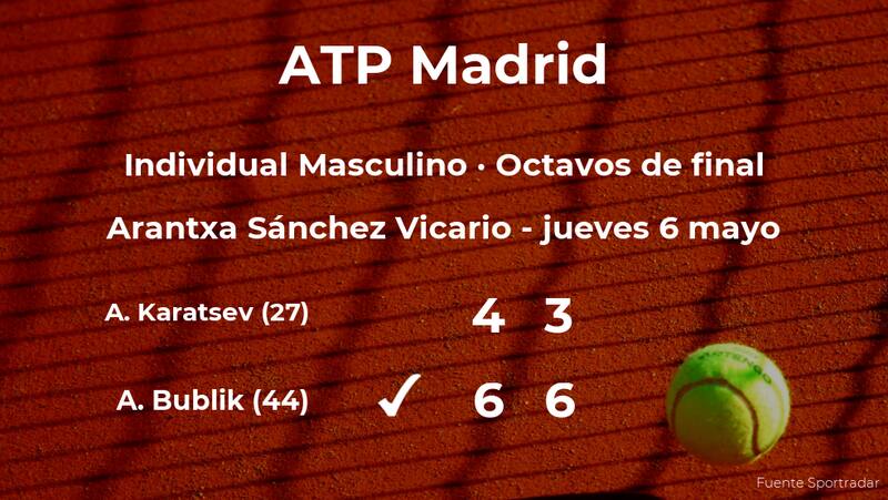 El jugador kazajo Alexander Bublik, número 44 de la ATP, ganó en los octavos de final del torneo ATP 1000 de Madrid en una hora y dieciséis minutos por 6-4 y 6-3 al jugador ruso Aslan Karatsev, número 27 de la ATP. Tras este resultado, seguiremos viendo al ganador del partido en la siguiente fase del torneo ATP 1000 de Madrid, los cuartos de final.