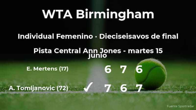 Ajla Tomljanovic, australiana, número 72 de la WTA, venció en los dieciseisavos de final del torneo WTA 250 de Birmingham por 7(7)-6(5), 6(5)-7(7) y 7(7)-6(4) en tres horas y once minutos a Elise Mertens, tenista belga, número 17 de la WTA y cabeza de serie número 1. Tras este resultado, la jugadora australiana consigue la plaza para los octavos de final del torneo WTA 250 de Birmingham.