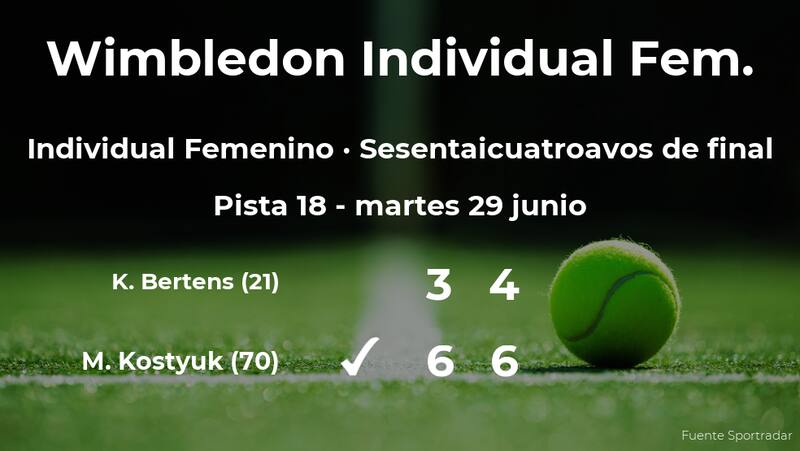 La ucraniana Marta Kostyuk, número 70 de la WTA, cumplió las previsiones al vencer por 6-3 y 6-4 a la jugadora neerlandesa Kiki Bertens, número 21 de la WTA y cabeza de serie número 17, en los sesentaicuatroavos de final de Wimbledon. Tras este resultado, podremos seguir viendo a la ganadora del partido en la siguiente fase de Wimbledon, los treintaidosavos de final.