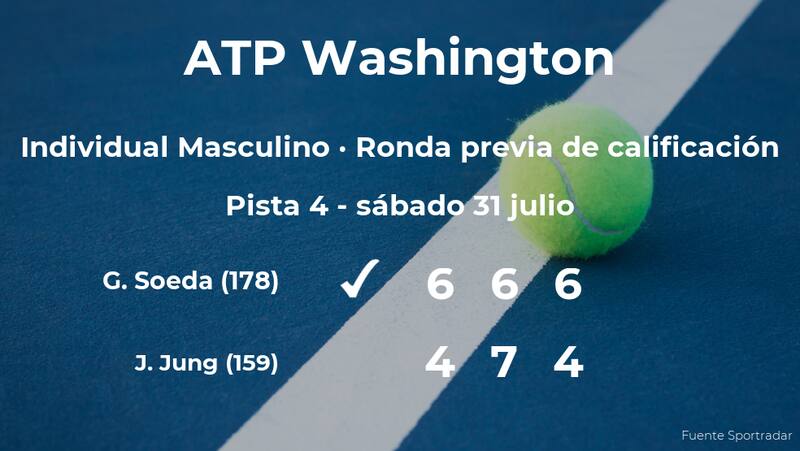 El tenista japonés Go Soeda, número 178 de la ATP, dio la sorpresa al vencer en dos horas y cuarenta y dos minutos por 6-4, 6-7 y 6-4 a Jason Jung, tenista, número 159 de la ATP, en la ronda previa de calificación del torneo ATP 500 de Washington D.C. Con esta victoria, el tenista consigue sumar nuevos puntos a su ranking para poder participar en el torneo ATP 500 de Washington D.C.