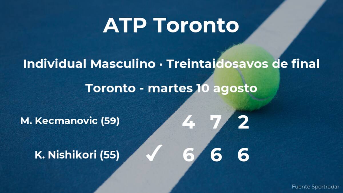 El tenista japonés Kei Nishikori, número 55 de la ATP, cumplió los pronósticos al ganar en los treintaidosavos de final del torneo ATP 1000 de Toronto por 6-4, 6(5)-7(7) y 6-2 en dos horas y diez minutos a Miomir Kecmanovic, tenista serbio, número 59 de la ATP. Con este resultado, el ganador estará en los dieciseisavos de final del torneo ATP 1000 de Toronto.