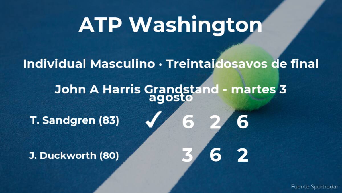 Tennys Sandgren, estadounidense, número 83 de la ATP, ganó en una hora y treinta y cinco minutos por 6-3, 2-6 y 6-2 a James Duckworth, tenista australiano, número 80 de la ATP, en los treintaidosavos de final del torneo ATP 500 de Washington D.C. Con este resultado, podremos seguir viendo al ganador del partido en la siguiente fase del torneo ATP 500 de Washington D.C., los dieciseisavos de final.