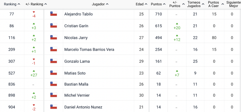 Nicolás Jarry, que también cayó en su última participación en el circuito en la segunda ronda, pero del Challenger de Nápoles, fue otro que pudo remontar puestos. Apareció 116°, tras haber ascendido dos posiciones.