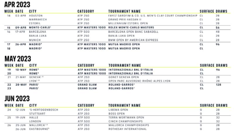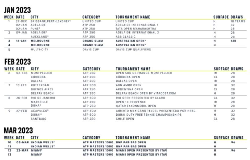 La nueva temporada tenística está a la vuelta de la esquina. Luego de un año marcado por los dos Grand Slams que conquistó Rafael Nadal (Abierto de Australia y Roland Garros) y el histórico número 1 del mundo que consiguió Carlos Alcaraz, la ATP reveló el calendario que se llevará a cabo en 2023.