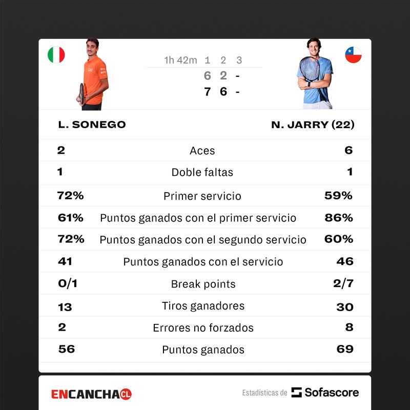 Fue un triunfo con sabor a revancha para Jarry, ante el mismo rival que lo sorprendió en la reciente Copa Davis. Una vez más, fue el chileno el que partió sacando diferencias, sobre todo tras ganar un primer set en tie-break luego de una hora de cerrada batalla. Pero en esta oportunidad no dio margen para recuperaciones y con un break en la segunda manga pudo consolidar su ventaja y llevarse el duelo por 7-6 y 6-2.