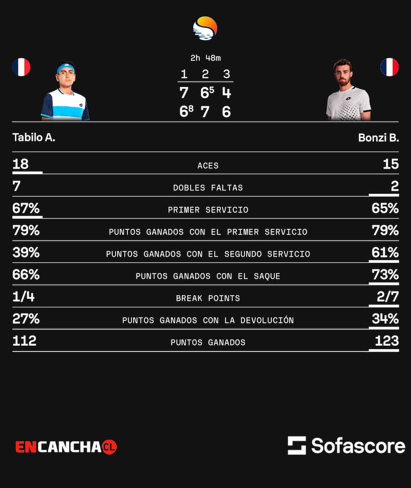 Hasta llegar al tercer y decisivo set, en que Bonzi, animado por el desenlace del anterior, impuso sus términos desde un comienzo. El europeo quebró en el tercer game y no volvió a mirar atrás: solo le bastó con mantener el servicio para quedarse con el parcial y el partido, con cuenta de 6-7, 7-6 y 6-4, en dos horas y 48 minutos de juego.