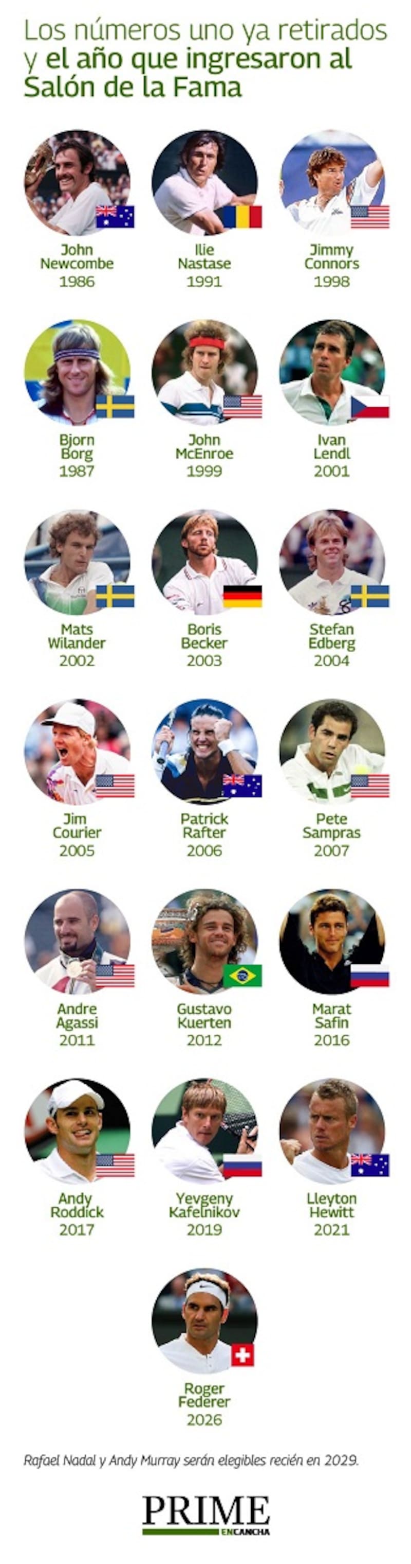 Es cosa de ver la historia. De los 25 jugadores que llegaron a la cima del ranking ATP y ya no juegan, 18 ya fueron inducidos. Federer se sumará el próximo año y, casi con total seguridad, pronto lo seguirán Nadal y Andy Murray.