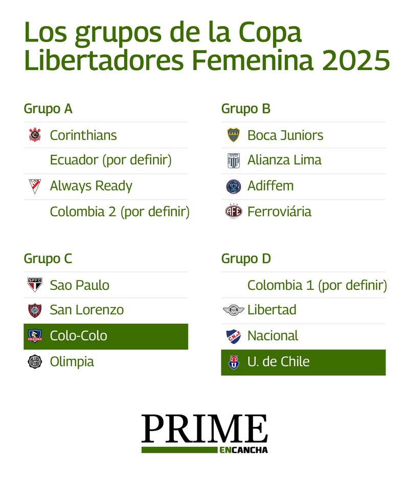 Sorteados también están los cuatro grupos de competencia para la primera fase, por lo que los representantes del fútbol femenino chileno, Colo Colo y Universidad de Chile, ya conocen los desafíos que deberán afrontar en el arranque del certamen, en busca de la gloria continental.
