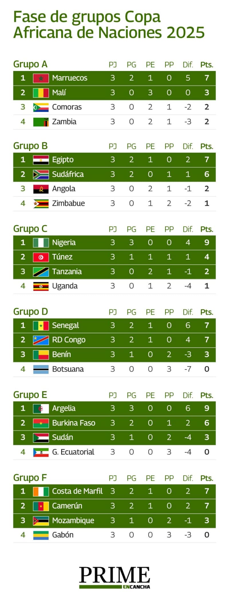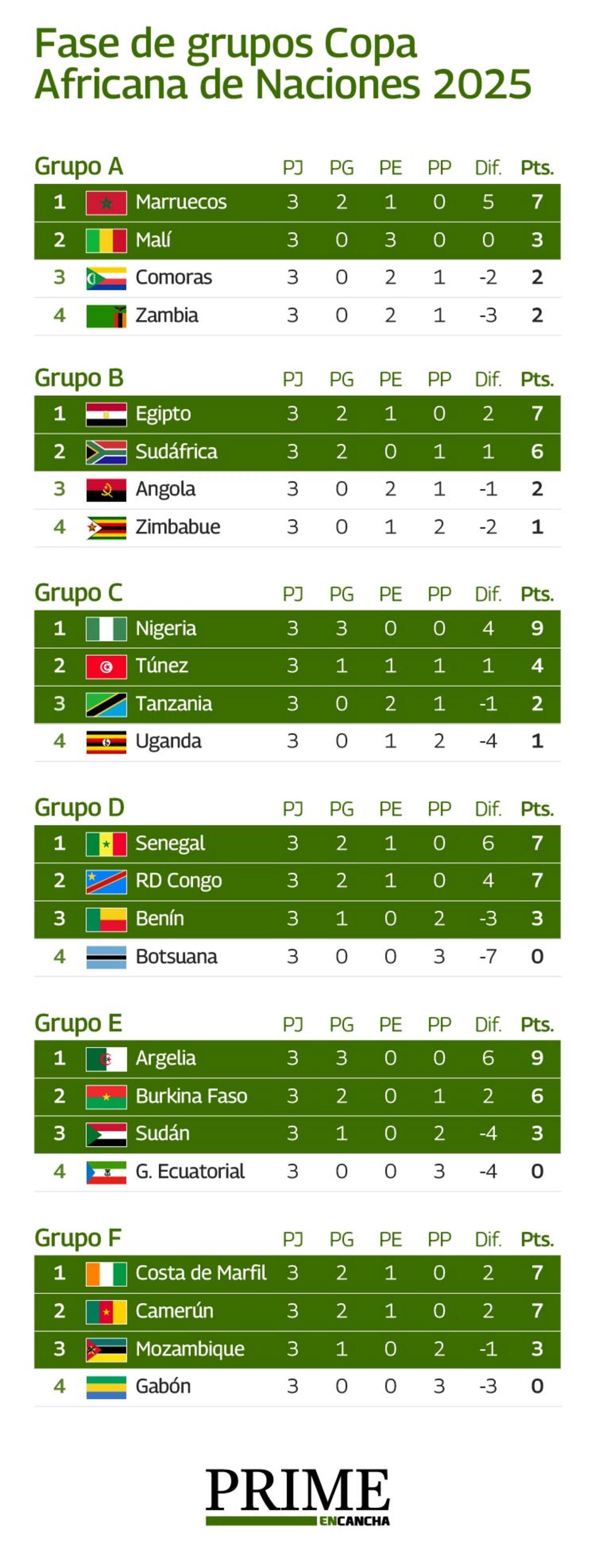 La Copa Africana 2025, la edición 35 del certamen, arrancó el 21 de diciembre del año y tiene fecha de término el próximo 18 de enero. Seis grupos, de cuatro integrantes cada uno, en que los dos mejores de cada llave, más los cuatro mejores terceros, clasifican a octavos de final. Cuadros poderosos en la lid, como el anfitrión Marruecos, Nigeria, Camerún, Egipto o Túnez; otros, mucho menos conocidos, como las Islas Comoras, Botsuana o Sudán. Todos, en busca de quedarse con el título que hoy está en manos de Costa de Marfil, vencedor de la edición 2023.