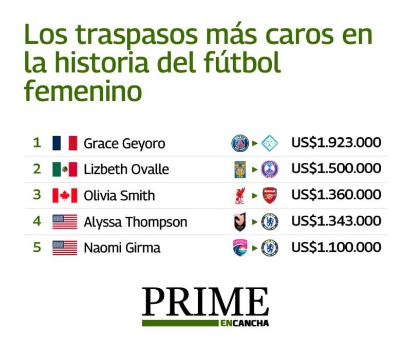 Luego, el 5 de septiembre recién pasado la estadounidense Alyssa Thompson viajó desde Angel City FC también al Chelsea por 1.343.000 dólares. No le alcanzó para desbancar a Ovalle, pero sí para meterse en el top 5. En cualquier otro año, lo de Thompson habría sido lo más caro de la historia; no en 2025.