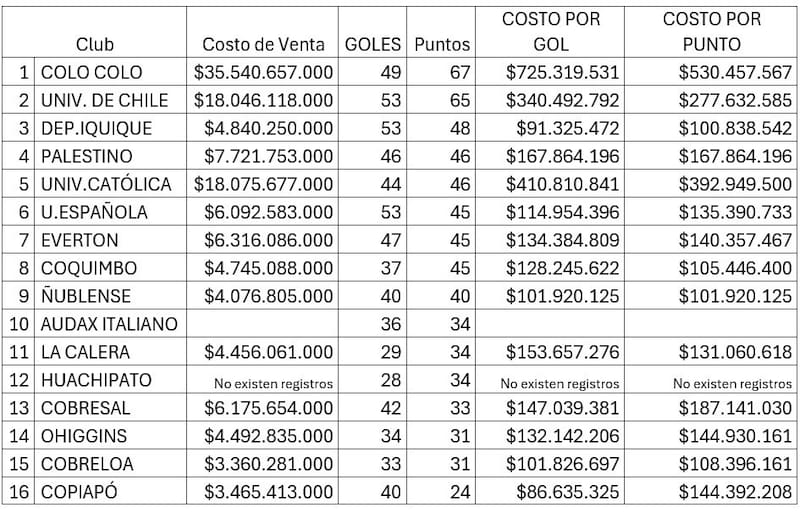 En el fútbol chileno, cada fin de semana (cuando no hay receso) se discute quién juega mejor, quién mereció ganar o si el VAR fue justo. Pero hay otra tabla, más silenciosa y menos mediática, donde los partidos no se ganan con goles sino con eficiencia: la tabla del costo por gol y costo por punto, basada en los estados financieros 2024 de los clubes de Primera División.