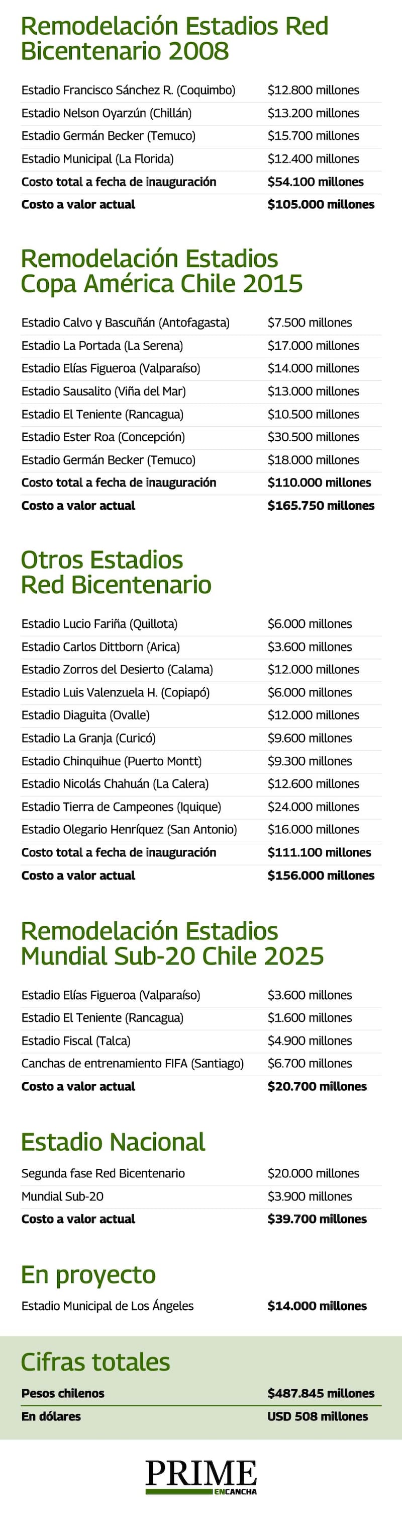 Entre la remodelación de los estadios, primero en la red Bicentenario del año 2008, luego para la Copa América de 2015, la continuación de las remodelaciones de la red Bicentenario, las destinadas a la próxima organización del Mundial Sub 20, la eterna remodelación del Estadio Nacional y otros proyectos futuros se han invertido casi medio billón de pesos chilenos ($487.845 millones), que ajustados al dólar son cerca de 508 millones de dólares (ver detalle al final de la columna).