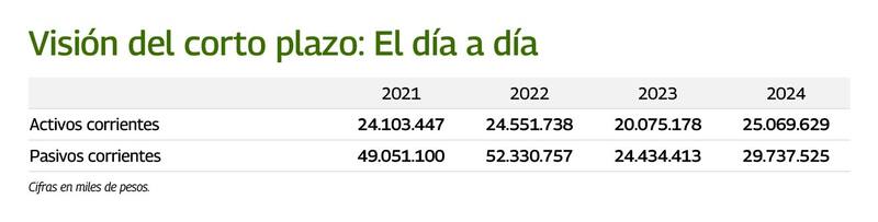 El capital de trabajo —esa simple resta entre lo que tienes y lo que debes en el corto plazo— es negativo todos los años. Y no por poco: en 2022, la organización tenía más del doble en pasivos corrientes (52 mil millones) que en activos corrientes (24 mil millones). Es como si su billetera tuviera $10.000, pero tuviera que pagar $22.000 mañana. Ya para 2024 las cosas “mejoran” y queda en -$4.500 millones de déficit.