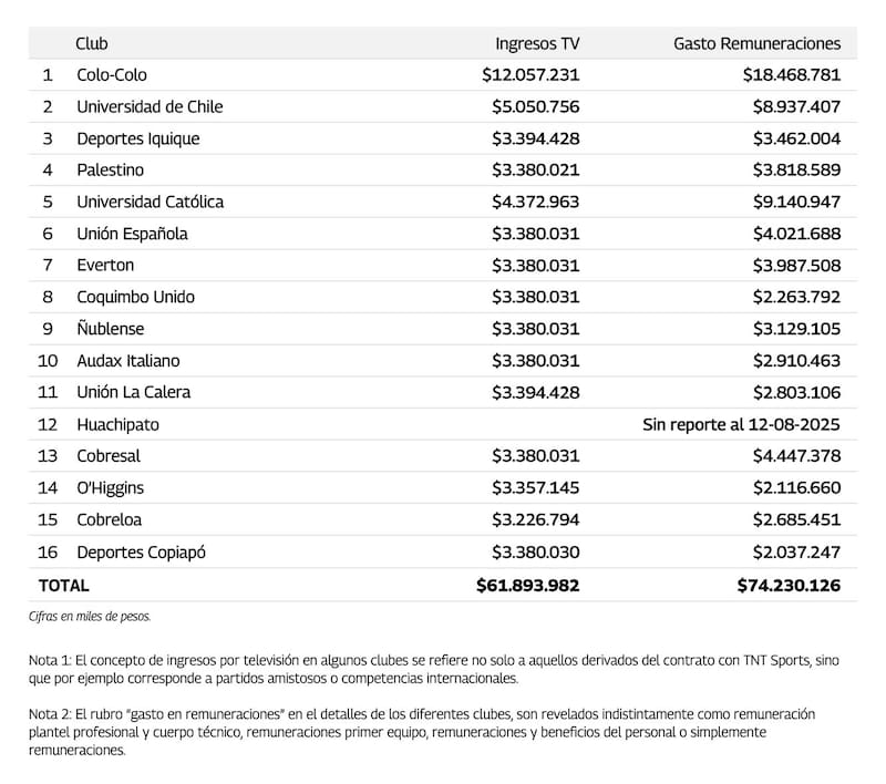 El futuro tampoco resulta auspicioso. Según los últimos reportes financieros del periodo 2024, los ingresos de la televisión para los clubes de la división de honor del fútbol profesional en Chile, ascendieron a $61.893 millones de pesos (solo Huachipato no figura con su información financiera en la CMF), mientras que el gasto total en remuneraciones de los planteles profesionales, arrojan cifras superiores a los $74.000 millones, reflejo del excesivo gasto que ya hemos advertido anteriormente en este mismo espacio.