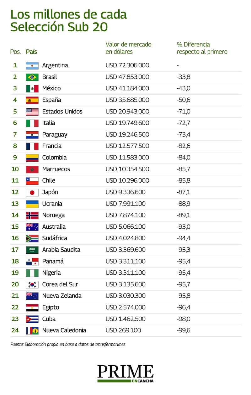 Y en el ítem contable, los números son brutales: Argentina encabeza con un plantel valorado en 72 millones de dólares, seguida por Brasil (47,8 millones) y México (41,1 millones).