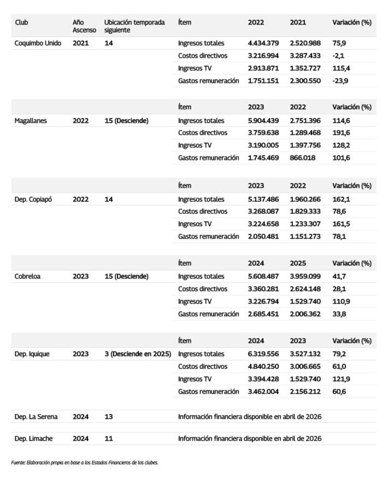 Un análisis de los clubes que ascendieron recientemente —Coquimbo Unido, Magallanes, Copiapó, Cobreloa, Iquique, La Serena y Limache— dibuja un panorama desalentador. En su primera temporada en la máxima categoría, estos equipos enfrentaron una dura realidad: ubicaciones en la tabla que oscilan entre el puesto 13 y 15, rozando peligrosamente la zona de descenso, a excepción de Iquique que logró un destacado tercer lugar al año siguiente de ascender pero en la temporada subsiguiente los Dragones Celestes pierden la categoría y jugarán en Primera B este próximo 2026. Los casos de Magallanes y Cobreloa fueron aún más dramáticos: no lograron consolidarse y regresaron en un año directamente a la categoría de la que tanto les había costado salir.