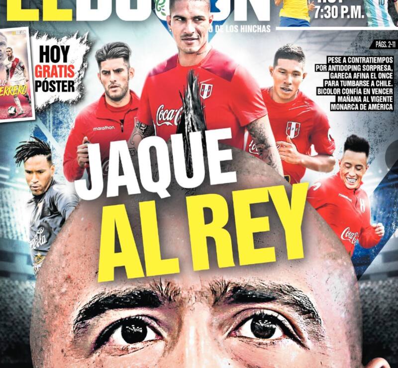 El matutino tituló su primera página con la frase 'Jaque al Rey' en la que ubicó a Vidal en la foto por debajo de jugadores peruanos en la que resalta el delantero Paolo Guerrero.