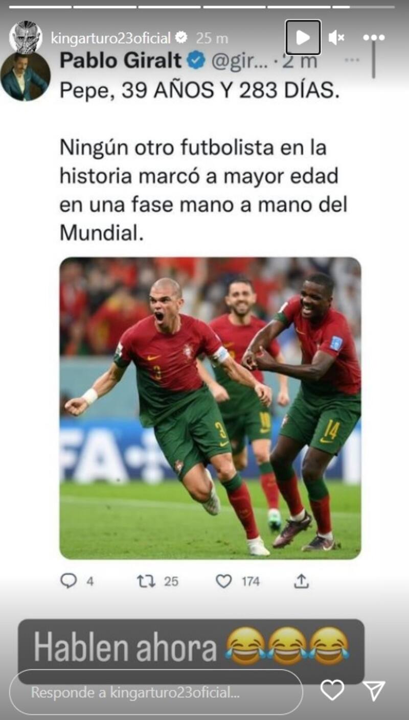 El mediocampista de 35 años publicó una historia con un claro mensaje: "Hablen ahora", escribió. Allí puso de ejemplo al defensor, Pepe, zaguero portugués, que a sus 39, se transformó en el futbolista más longevo en anotar en una fase eliminatoria de un Mundial, en el triunfo 6-1 de Portugal sobre Suiza por los octavos de final de Qatar 2022.