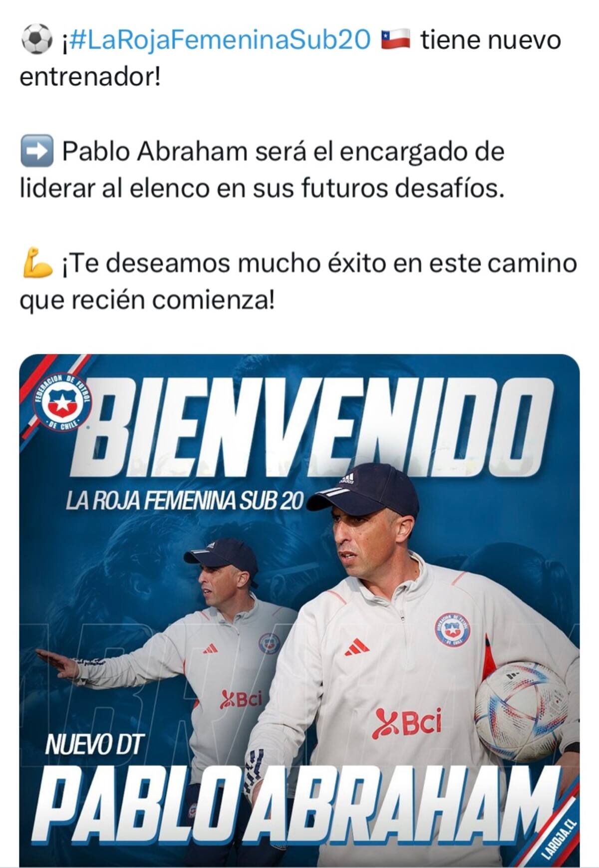 En una publicación en las redes sociales, desde Quilín anunciaron la llegada del entrenador, con el mensaje “La Roja Femenina Sub 20 tiene nuevo DT. Pablo Abraham será el encargado de liderar al elenco en sus futuros desafíos. ¡Te deseamos mucho éxito en este camino que recién comienza!”.