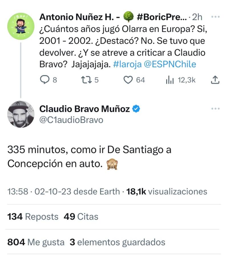 La respuesta vino este lunes de parte del portero. Indirectamente, pues comentó una publicación en Twitter de un usuario quien atacó al ex defensor de la UC y la U por criticar al “1″: “¿Cuántos años jugó Olarra en Europa? Sí, 2001-2002. ¿Destacó? No. Se tuvo que devolver. ¿Y se atreve a criticar a Claudio Bravo?”.