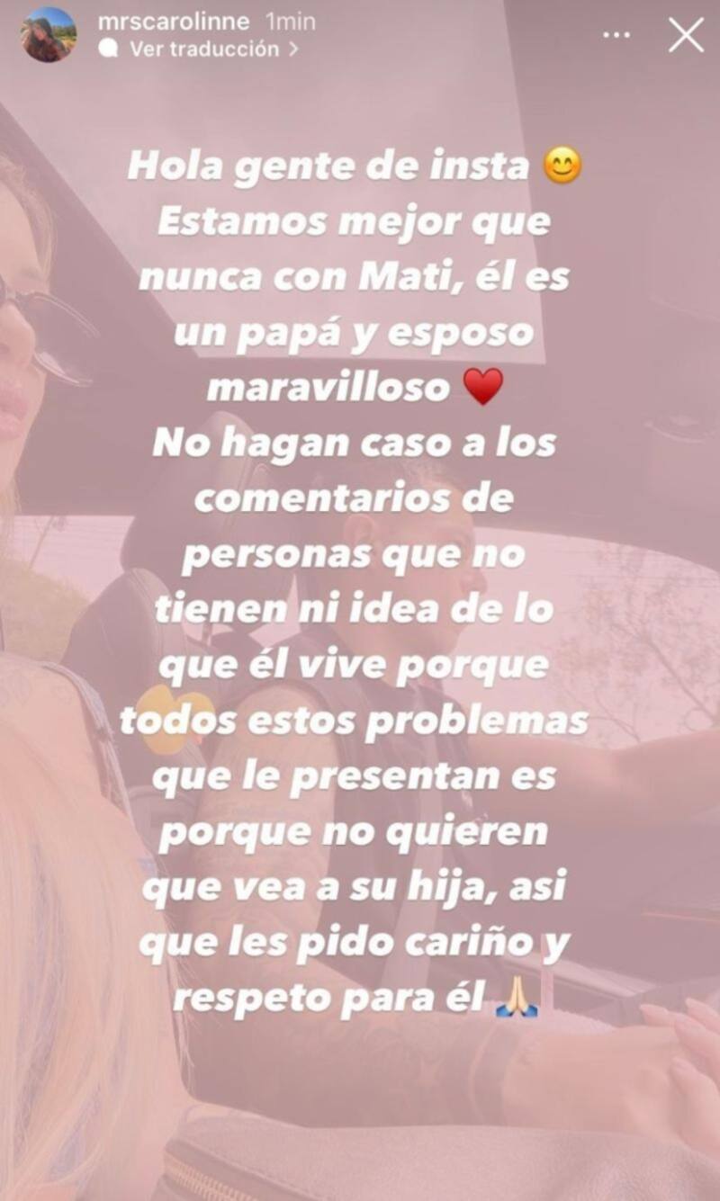 La actual pareja del jugador formado en Santiago Wanderers, Lesly Otto, utilizó su cuenta de Instagram (@mrscarolinne) para respaldar al defensor. En una publicación en sus historias, la mujer dijo que “estamos mejor que nunca con Mati, él es un papá y esposo maravilloso”.