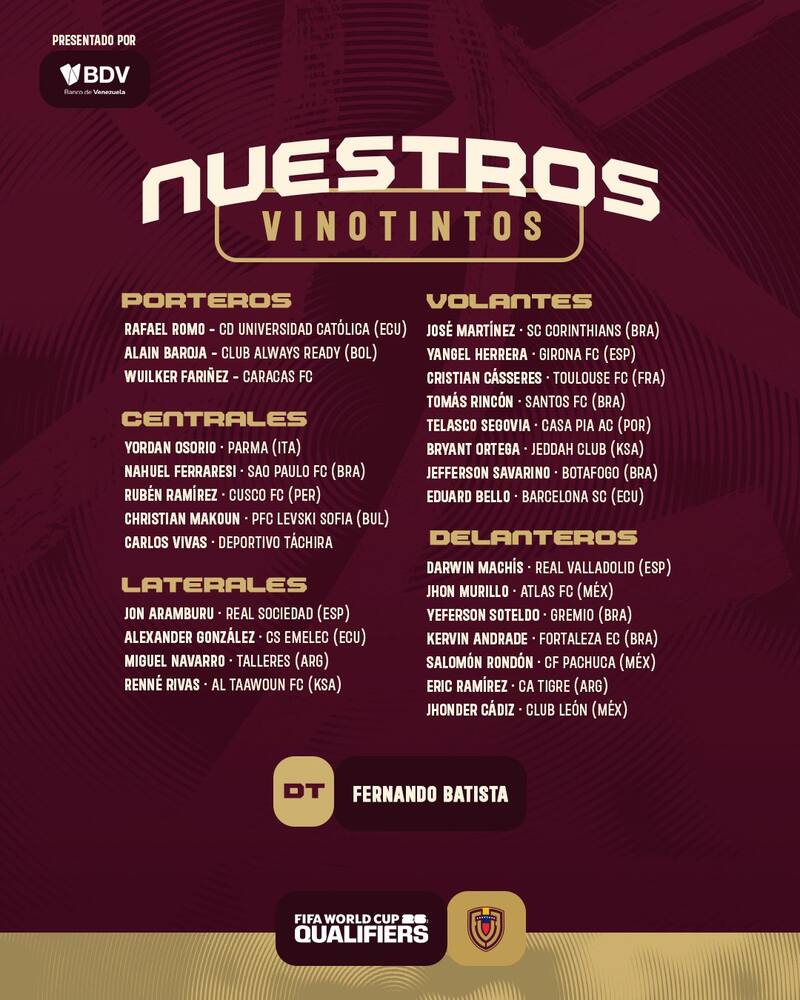 El entrenador de la escuadra Llanera entregó este lunes la convocatoria de 27 futbolistas para afrontar los duelos ante Brasil y Chile, correspondientes a las fechas 11 y 12 de la carrera sudamericana para la Copa del Mundo que se jugará en Norteamérica.