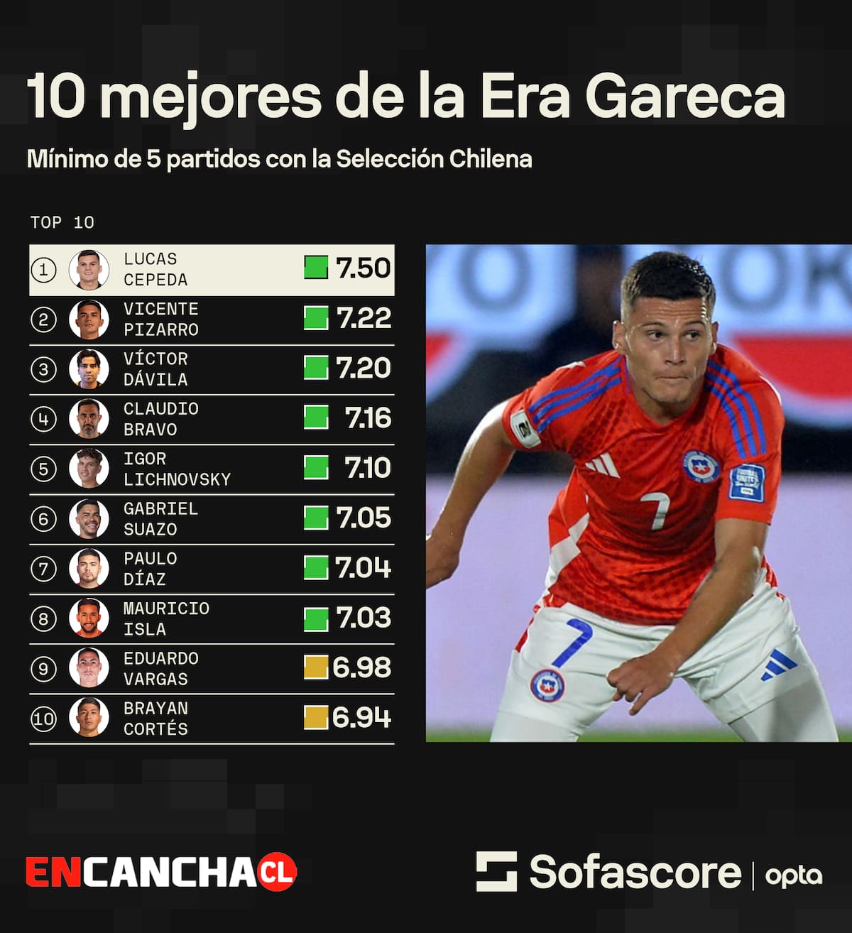En ese contexto, el futbolista que mejor rendimiento mostró es el colocolino Lucas Cepeda, quien acumula una evaluación de 7.50, seguido por Vicente Pizarro (7.22) y Víctor Dávila (7.20).