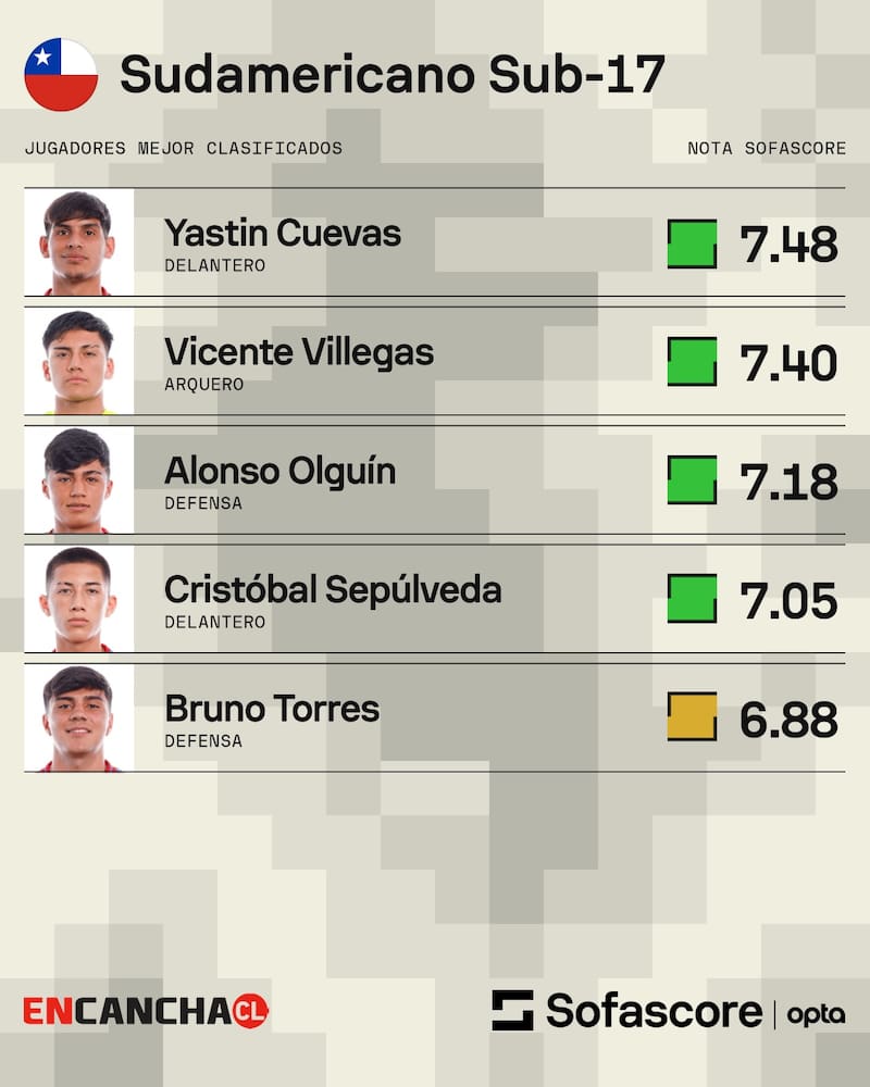Cuevas, quien jugó los seis partidos de La Roja, encabeza las calificaciones, junto con el argentino Thomás de Martis, con la misma puntuación. Más atrás están Justin Lerma de Ecuador (7.45), Vicente Villegas de Chile (7.40) y Joaquín Piñeyro, también albiceleste (7.40).