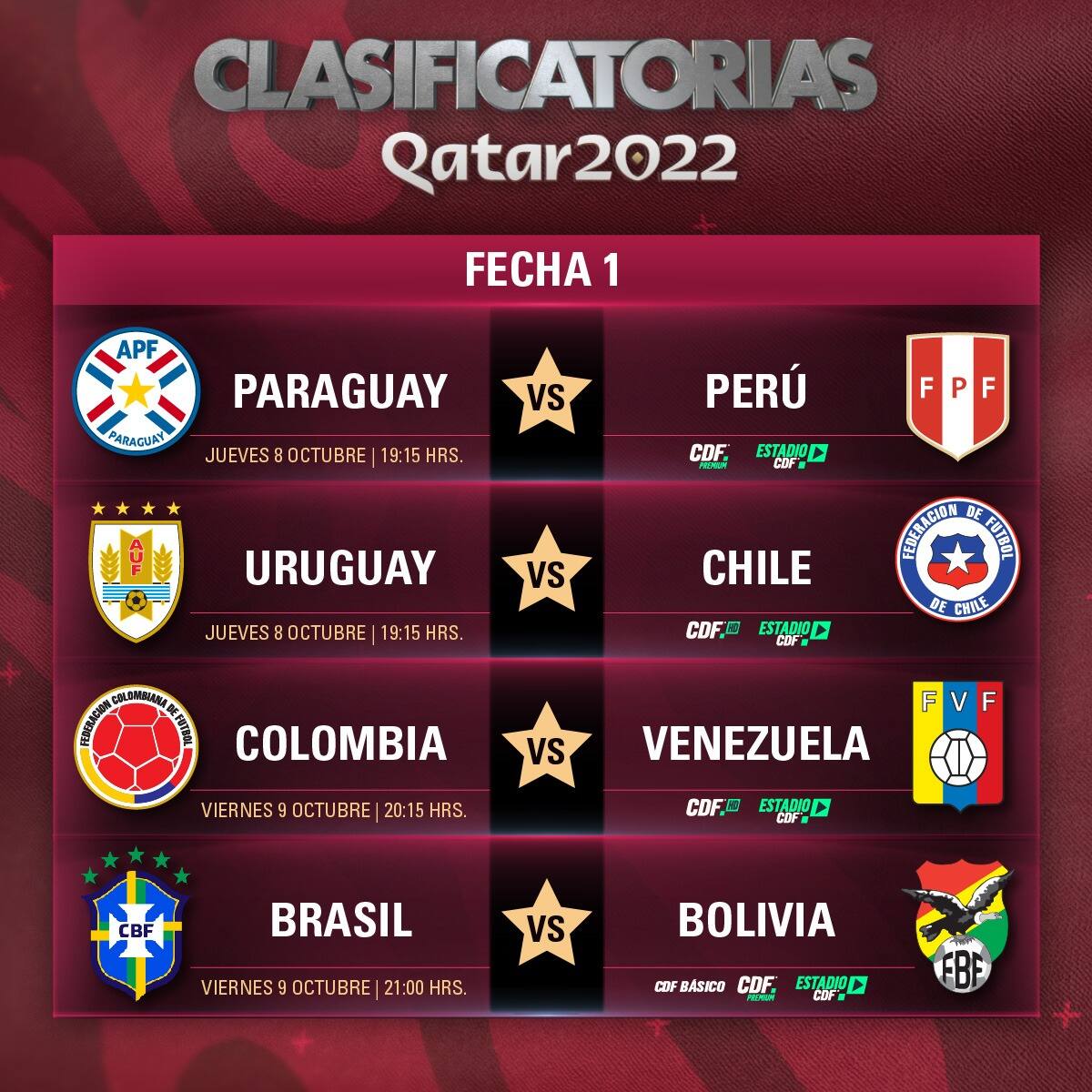 La primera jornada comenzará a jugarse este jueves 8 de octubre, con una serie de apasionantes encuentros, entre los cuales destaca el enfrentamiento entre Uruguay y Chile. El equipo de Reinaldo Rueda visitará a los charrúas en Montevideo, buscando arrancar con el pie derecho en este nuevo camino. Sin embargo, no tendrá una tarea fácil, ya que los uruguayos buscarán imponer la localía, aunque sin poder contar con una de sus máximas figuras, como Edinson Cavani. Partido electrizante, que se disputará a las 19:45 horas y que será transmitido por CDF HD y Estadio CDF, con los relatos y comentarios de Ignacio Valenzuela, Claudio Borghi y Manuel De Tezanos. En paralelo, Paraguay y Perú se enfrentarán en el Estadio Defensores del Chaco, en Asunción. Guaraníes e incaicos buscarán obtener los primeros puntos que los encaminen rumbo a la cita planetaria. Los dirigidos por Eduardo Berizzo, ex técnico campeón con O’Higgins, aspiran a estar presentes en Qatar, tras ausentarse de Brasil y Rusia. Por su parte, Ricardo Gareca buscará llevar a los del Rímac a su segundo mundial al hilo Otro interesante duelo de la jornada inaugural serán el que disputen Colombia y Venezuela, en Barranquilla. Los cafetaleros, próximo rival de Chile, presentan como líderes a Falcao, Rodríguez y Zapata, buscando conseguir su primera victoria y enrielar su camino a un tercer mundial consecutivo. En tanto, Venezuela tiene como principal objetivo robar puntos como visita que le permitan persistir en el sueño de clasificar a su primera copa del mundo. Un choque que también destaca en la primera fecha es el de Brasil, que enfrentará el viernes a Bolivia en Sao Paulo, en el que se anticipa como un encuentro sin mayores complicaciones para la Verde-Amarella. Entre las figuras convocadas por el técnico Tite, destacan Neymar y Rodrygo Goes, promesa del fútbol brasileño que hoy milita en el Real Madrid. A estos se suma el atacante Roberto Firmino, quien también promete complicar a la defensa boliviana. Un mes de octubre que llega cargado de fútbol por las pantallas de CDF, con el Campeonato PlanVital 2020, la Primera B y las Clasificatorias a Qatar 2022, todo con la más completa transmisión y cobertura de la señal deportiva de WarnerMedia Chile.