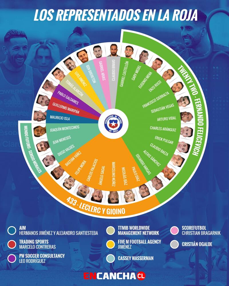 La agencia que tiene más jugadores en el actual listado de Lasarte es Twenty Two, cuyo dueño es Fernando Felicevich, el que posee a la mayoría de la "Generación Dorada". En esta ocasión, su empresa, incluyendo a los lesionados Eugenio Mena y Eduardo Vargas, aporta con doce futbolistas, entre ellos Alexis Sánchez, Arturo Vidal, Charles Aránguiz y Gary Medel.